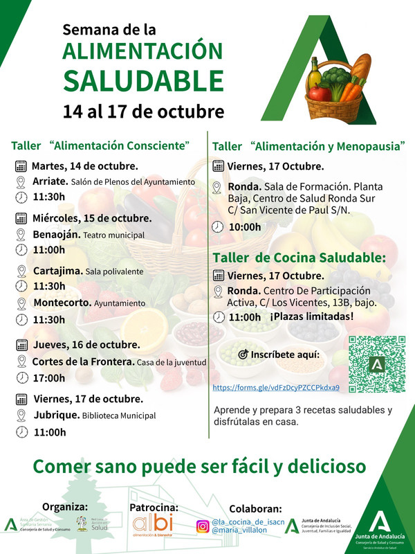 10:00 Taller "Alimentación y menopausia". Sala de formación en el Centro de Salud Ronda Sur ( Calle San Vicente de Paul) 11:00 Taller de cocina saludable. Centro de Participación activa ( Calle los Vicentes,13B,bajo). Plazas limitadas.